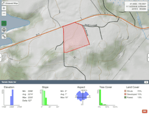 Caltopo’s more advanced tools can provide a Simulated View from any location (think of google street view), display the elevation profile of any line, and find terrain statistics for a selected polygon including slope, aspect, elevation, and ground cover.