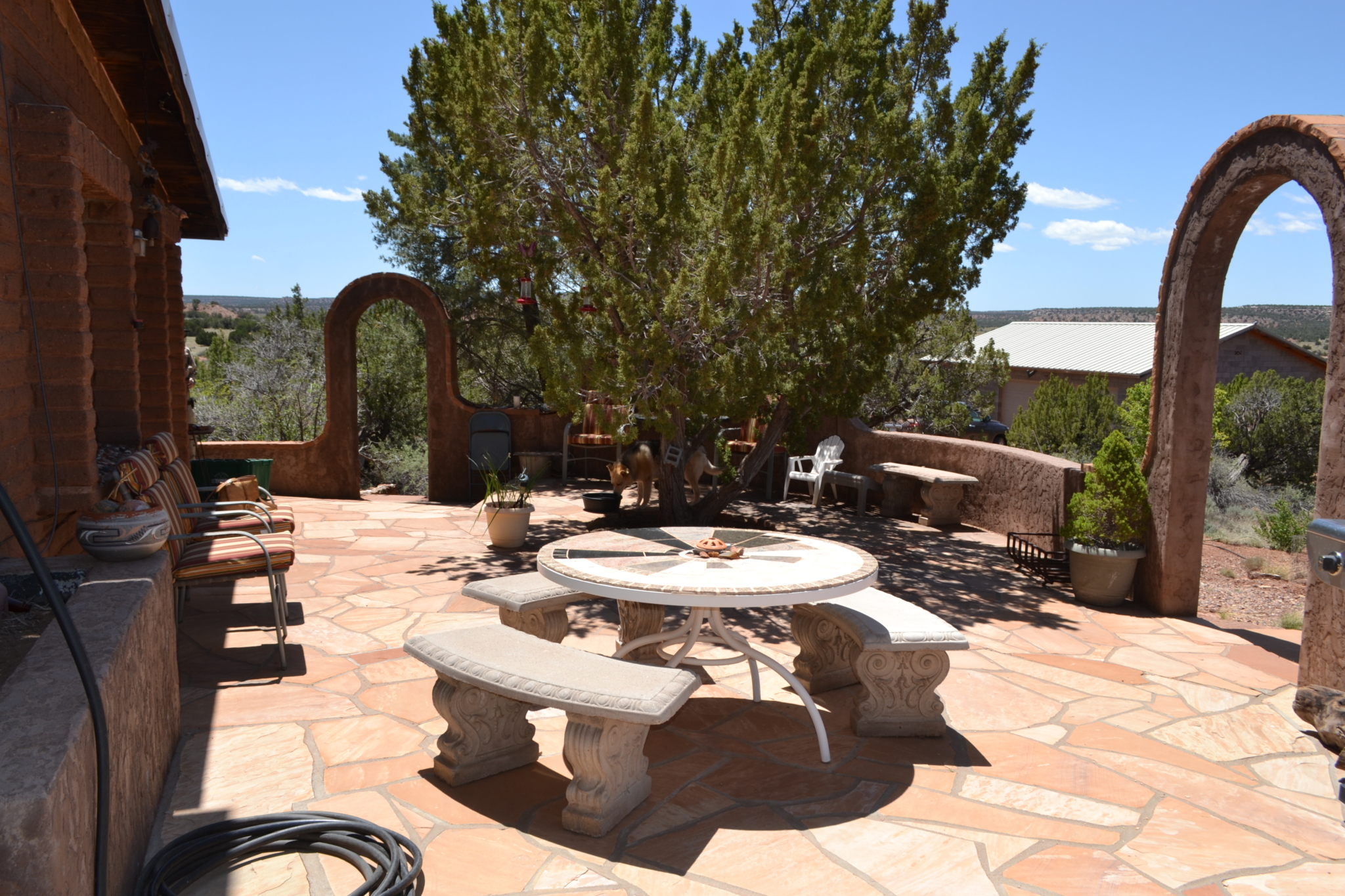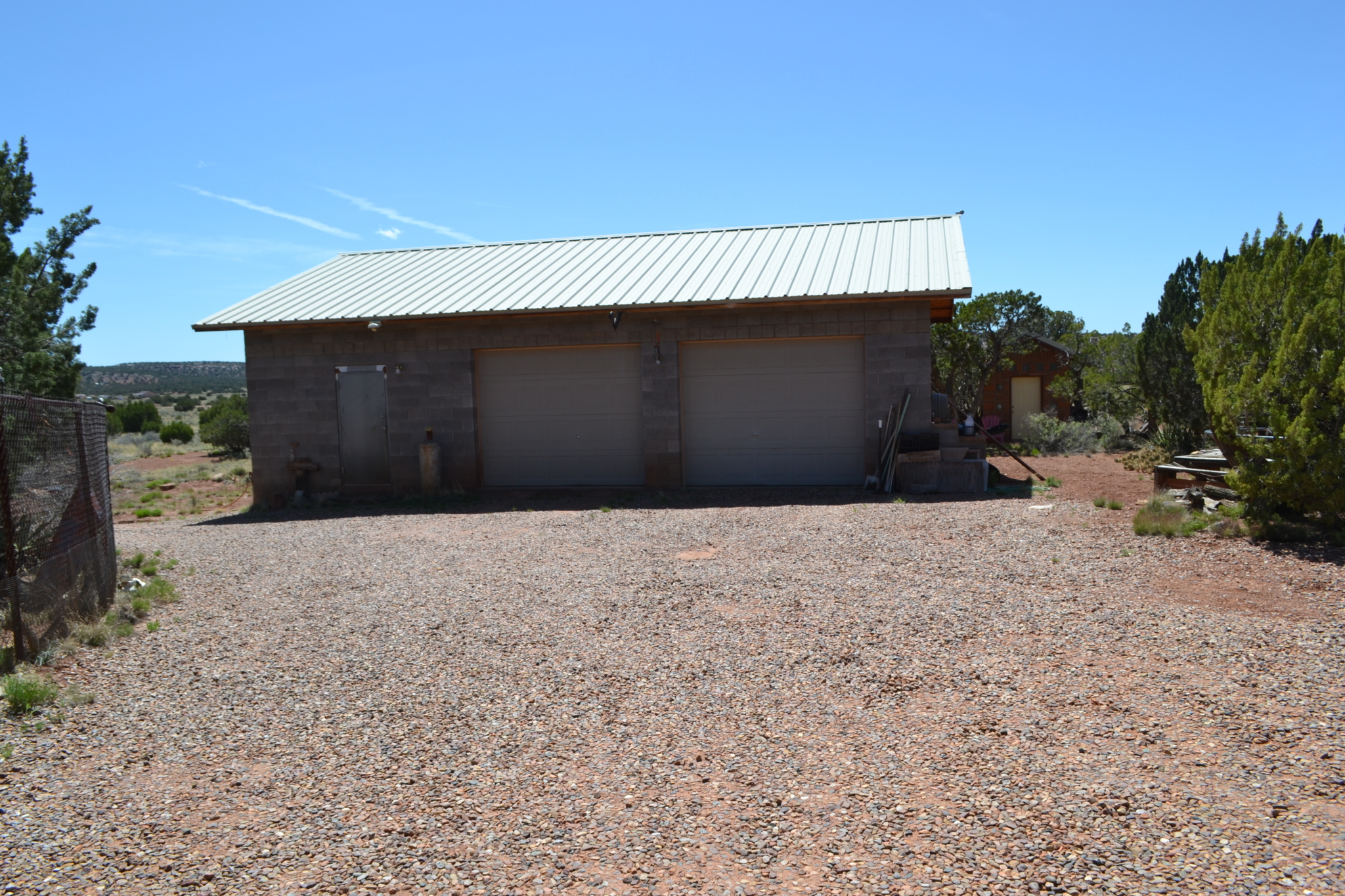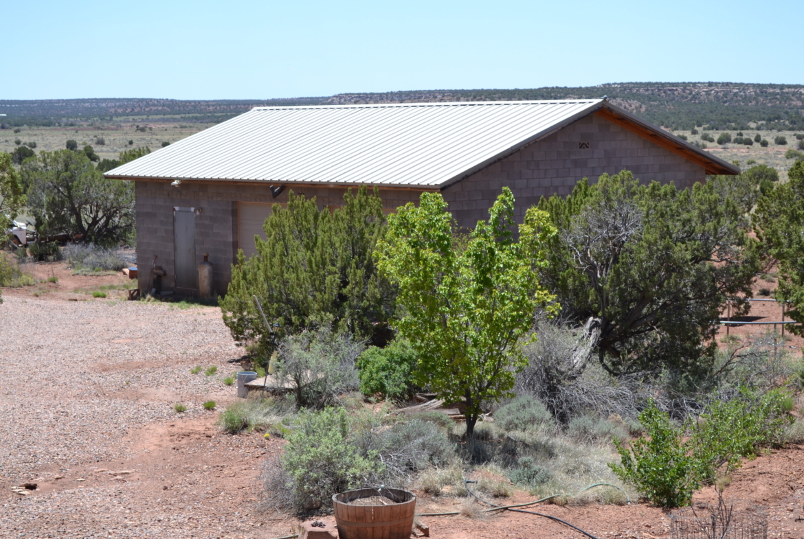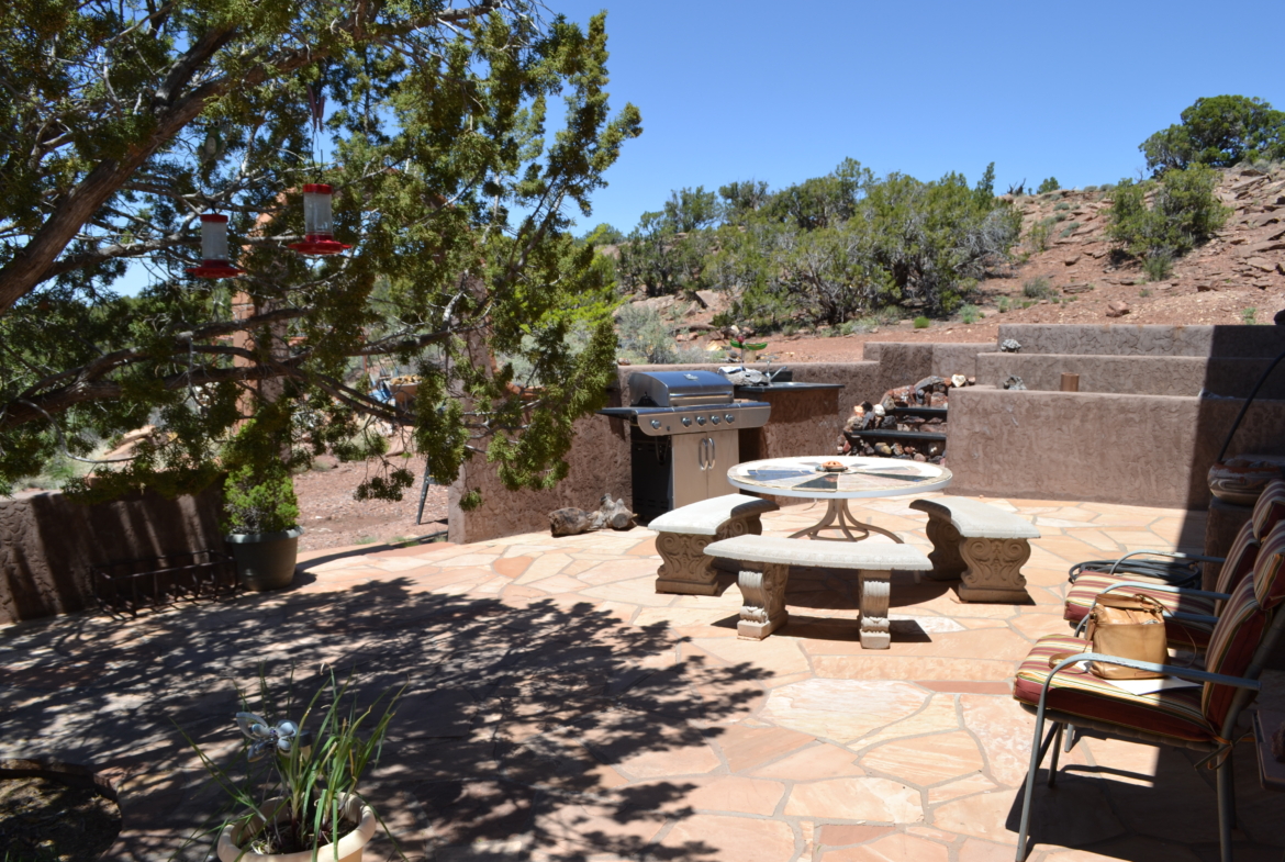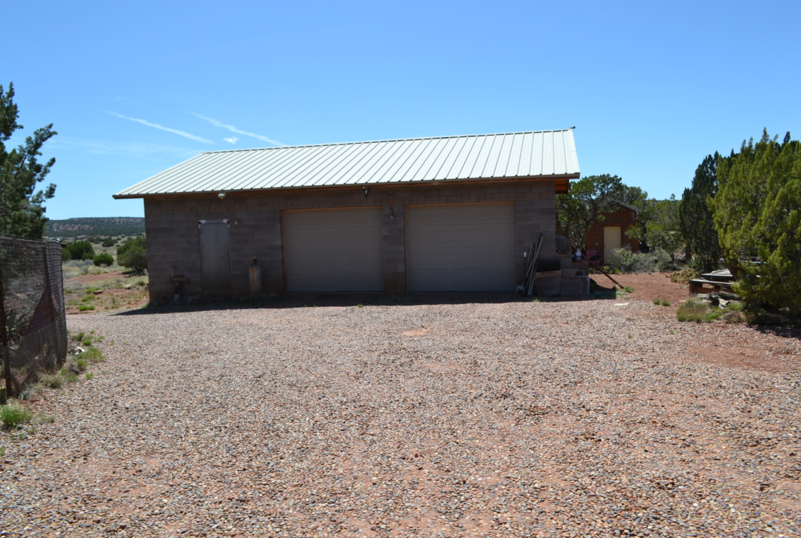 Beautiful, secluded property, nestled in the foothills of the Black Mesa to the East. The views are incredible. The owner built this home himself (he had a Masonry License when he built the home). Very sturdy home, built with concrete blocks and Adobe bricks, well insulated with foam and stucco. Passive solar from the Arizona Room. Lovely courtyard area with water feature, built in sink. Patio area also to the East side of the house. Nice kitchen with center island, wood burning stove in great room area and fireplace in the living room area. Attractive feature floor in the downstairs bathroom, along with a small soak in tub (owners grandchildren loved it when they were small). 30×40 detached garage with 8’’ high doors, concrete block construction. Small studio behind garage.