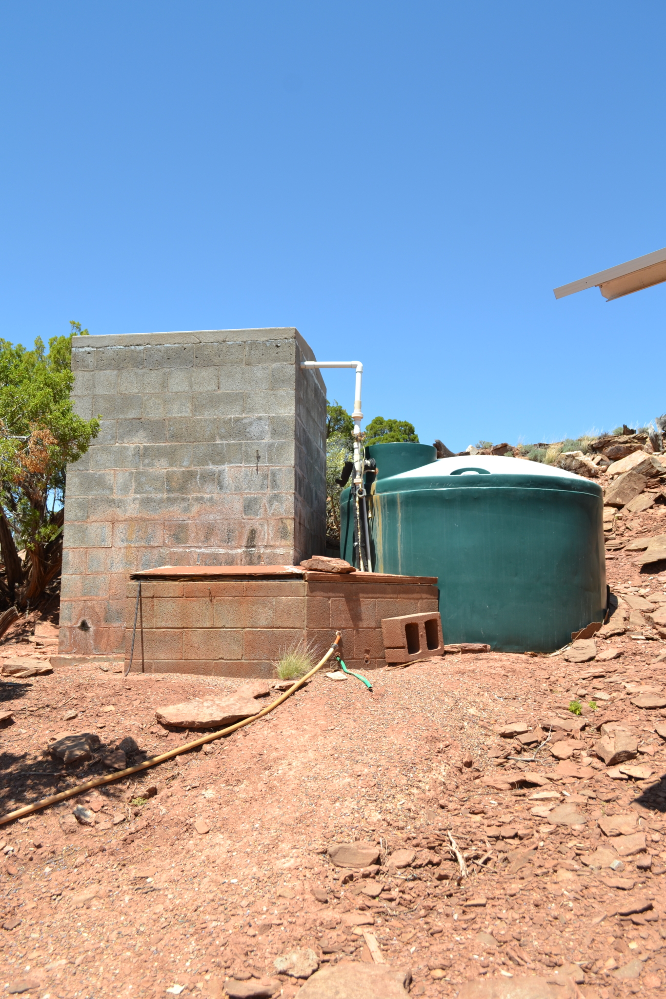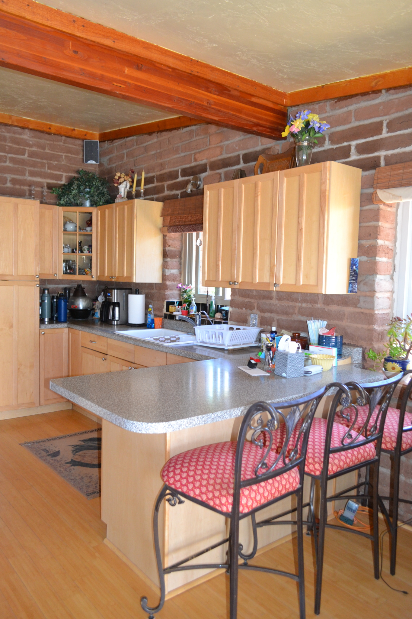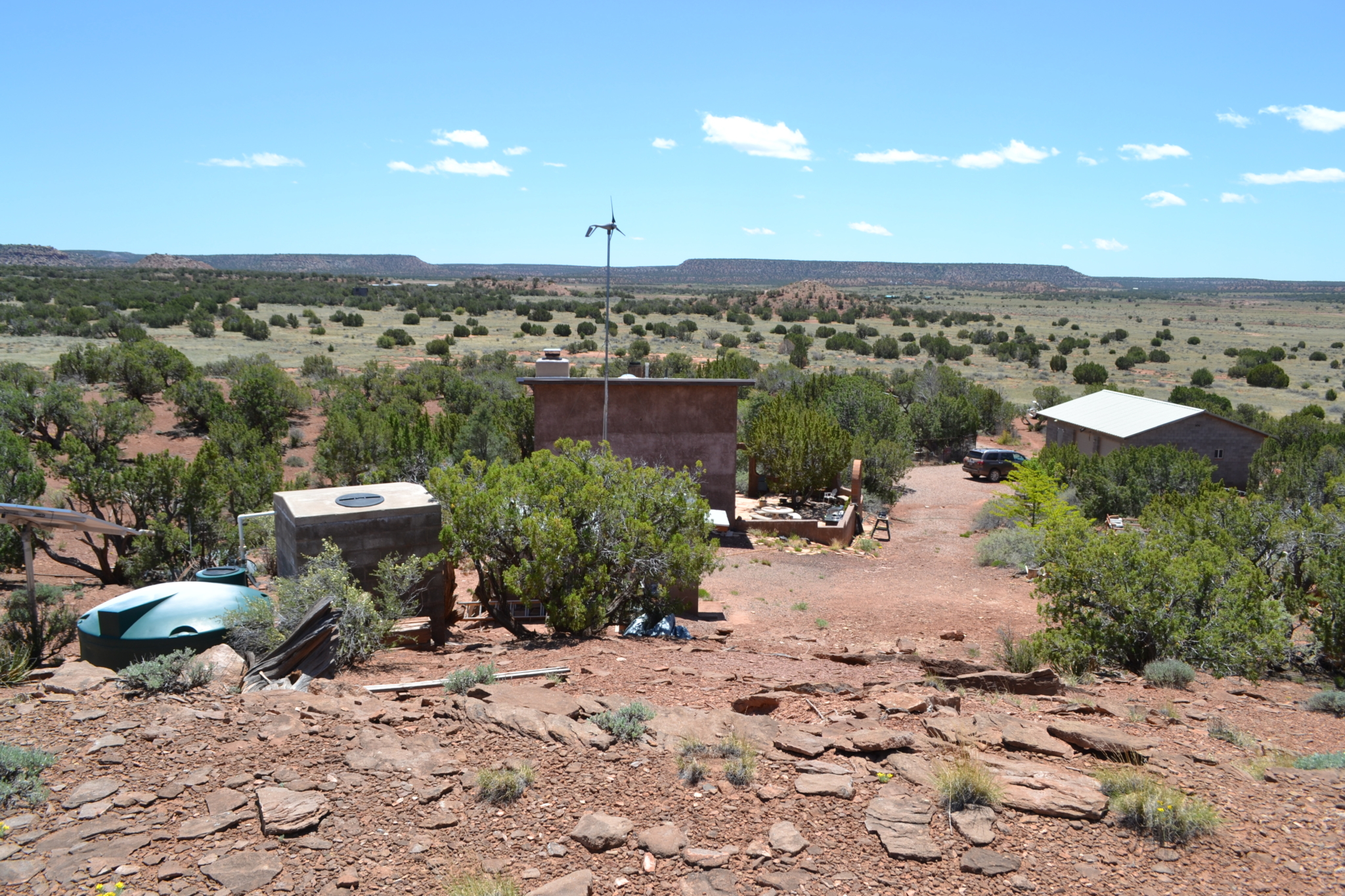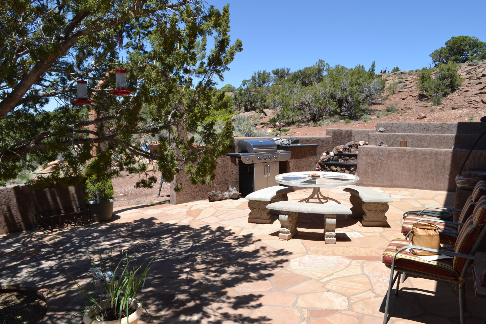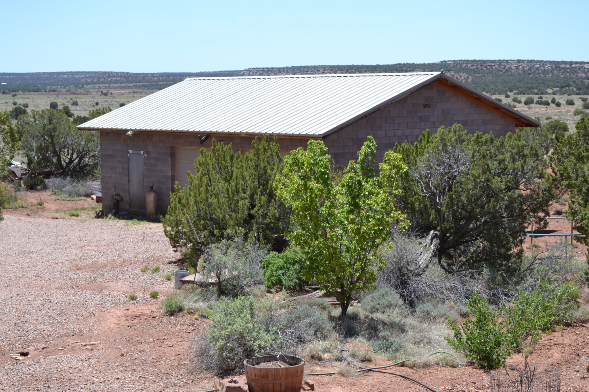 Beautiful, secluded property, nestled in the foothills of the Black Mesa to the East. The views are incredible. The owner built this home himself (he had a Masonry License when he built the home). Very sturdy home, built with concrete blocks and Adobe bricks, well insulated with foam and stucco. Passive solar from the Arizona Room. Lovely courtyard area with water feature, built in sink. Patio area also to the East side of the house. Nice kitchen with center island, wood burning stove in great room area and fireplace in the living room area. Attractive feature floor in the downstairs bathroom, along with a small soak in tub (owners grandchildren loved it when they were small). 30×40 detached garage with 8’’ high doors, concrete block construction. Small studio behind garage.