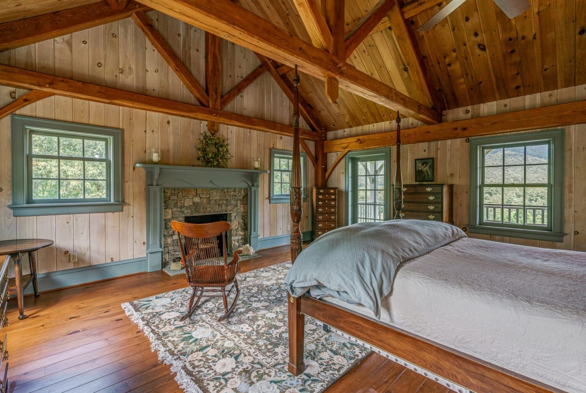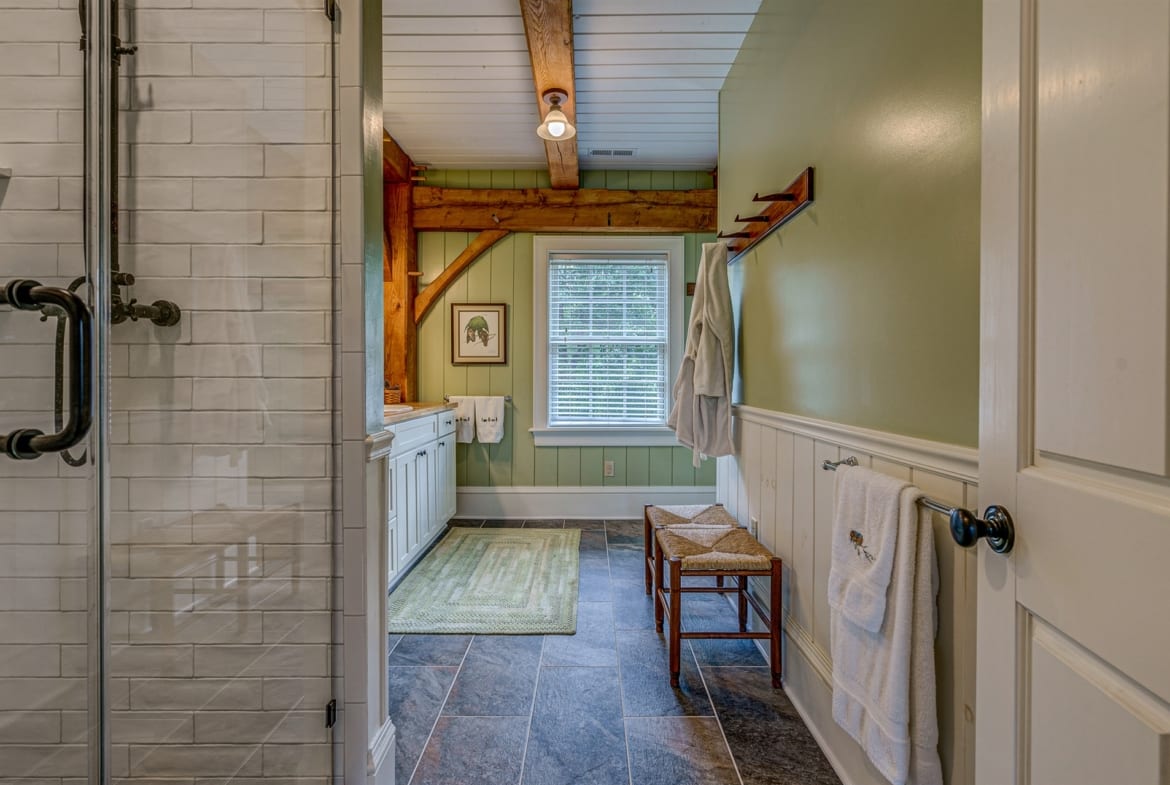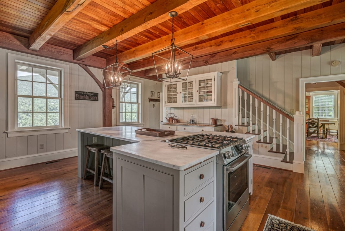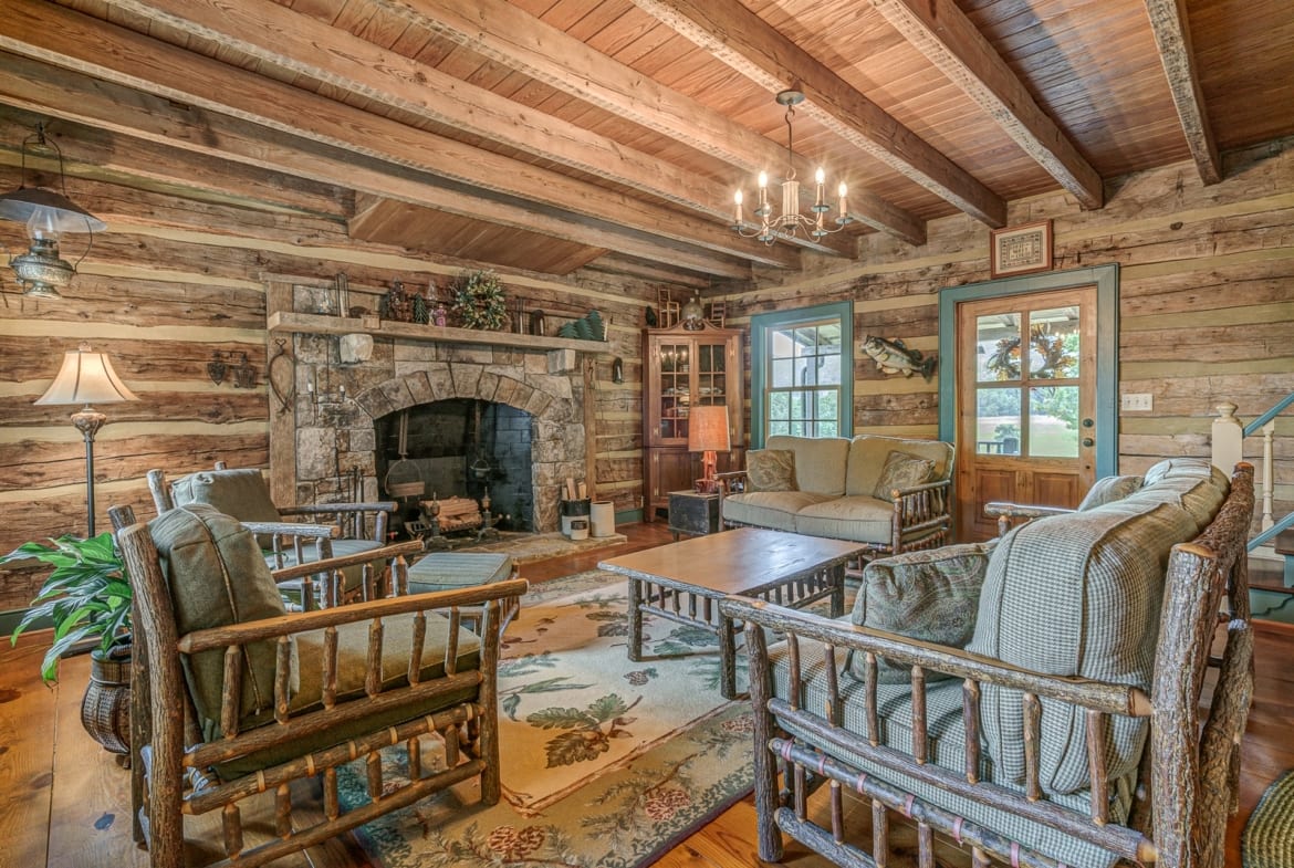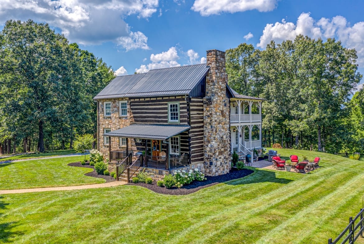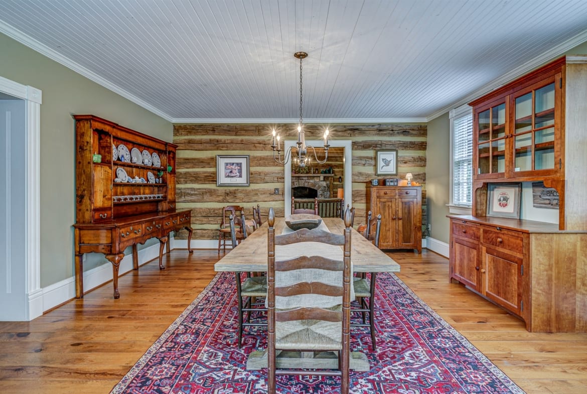 For the custom-built home, the original log cabin was relocated from WV and rebuilt while the stone portion of the home, including 5 large fireplaces, 2 chimneys and exterior walls, was constructed using stone sourced from the property. The interior millwork including solid-core doors and 11″ baseboard was custom milled and constructed on-site. Major restoration efforts to return the home and property to its original glory began in 2017 and were completed in 2020.