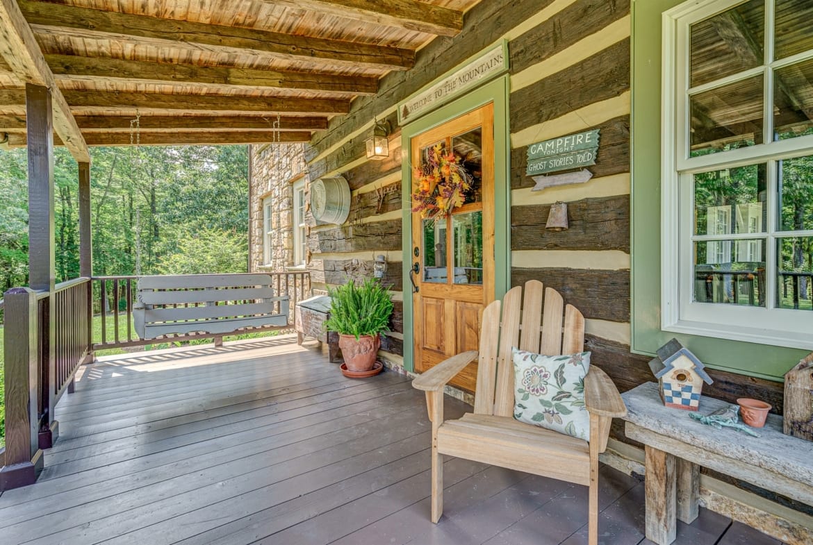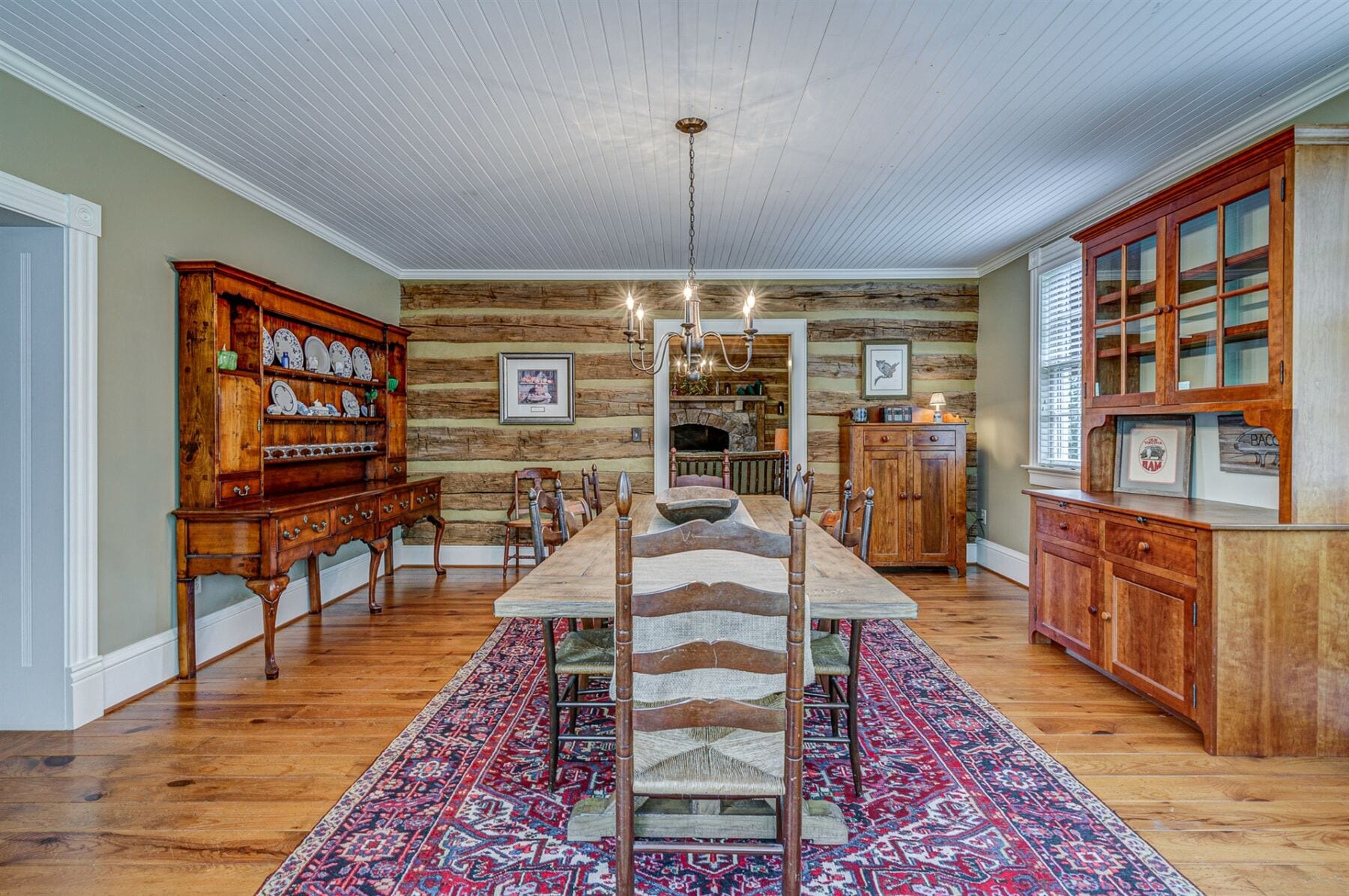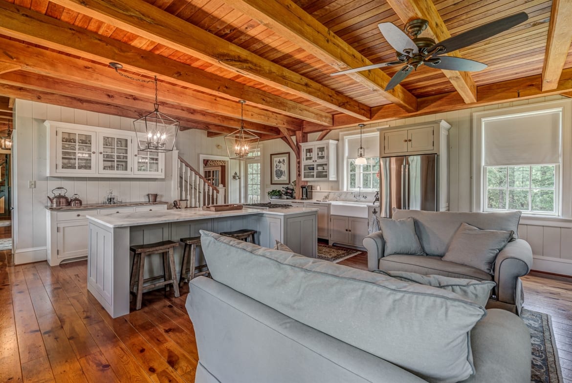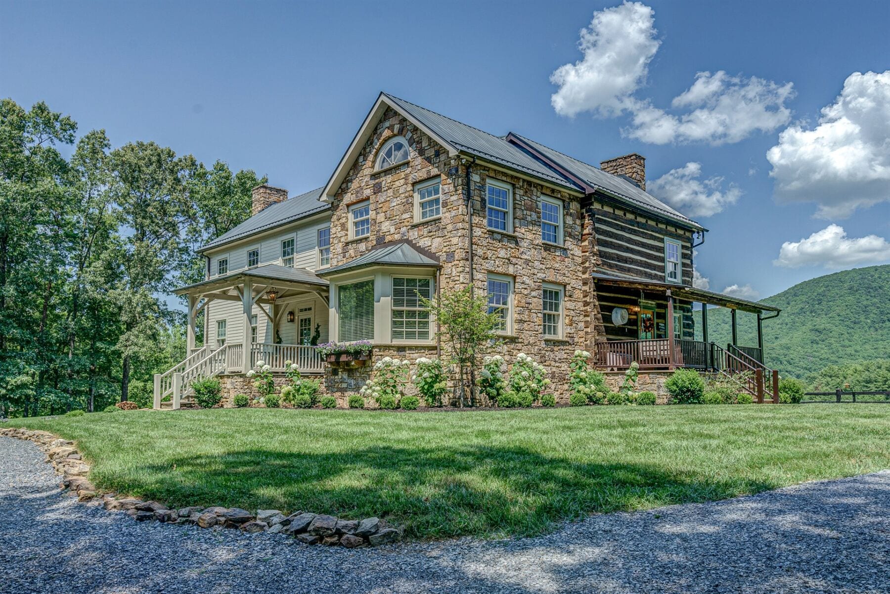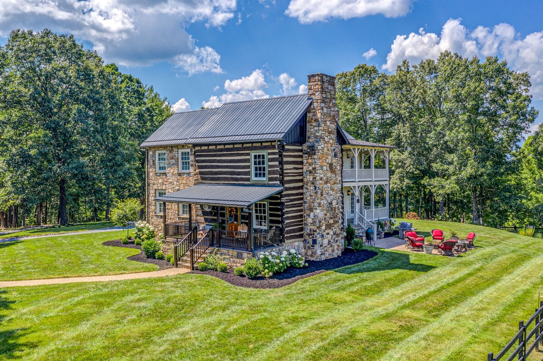 For the custom-built home, the original log cabin was relocated from WV and rebuilt while the stone portion of the home, including 5 large fireplaces, 2 chimneys and exterior walls, was constructed using stone sourced from the property. The interior millwork including solid-core doors and 11″ baseboard was custom milled and constructed on-site. Major restoration efforts to return the home and property to its original glory began in 2017 and were completed in 2020.