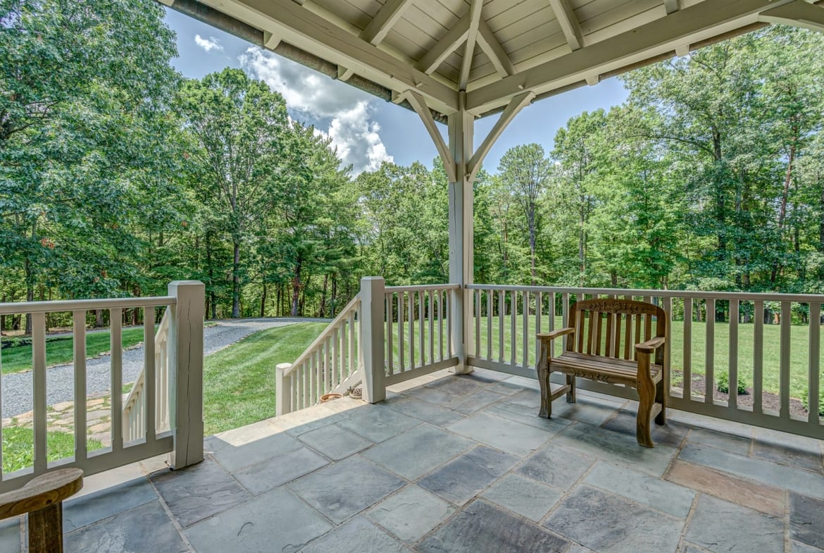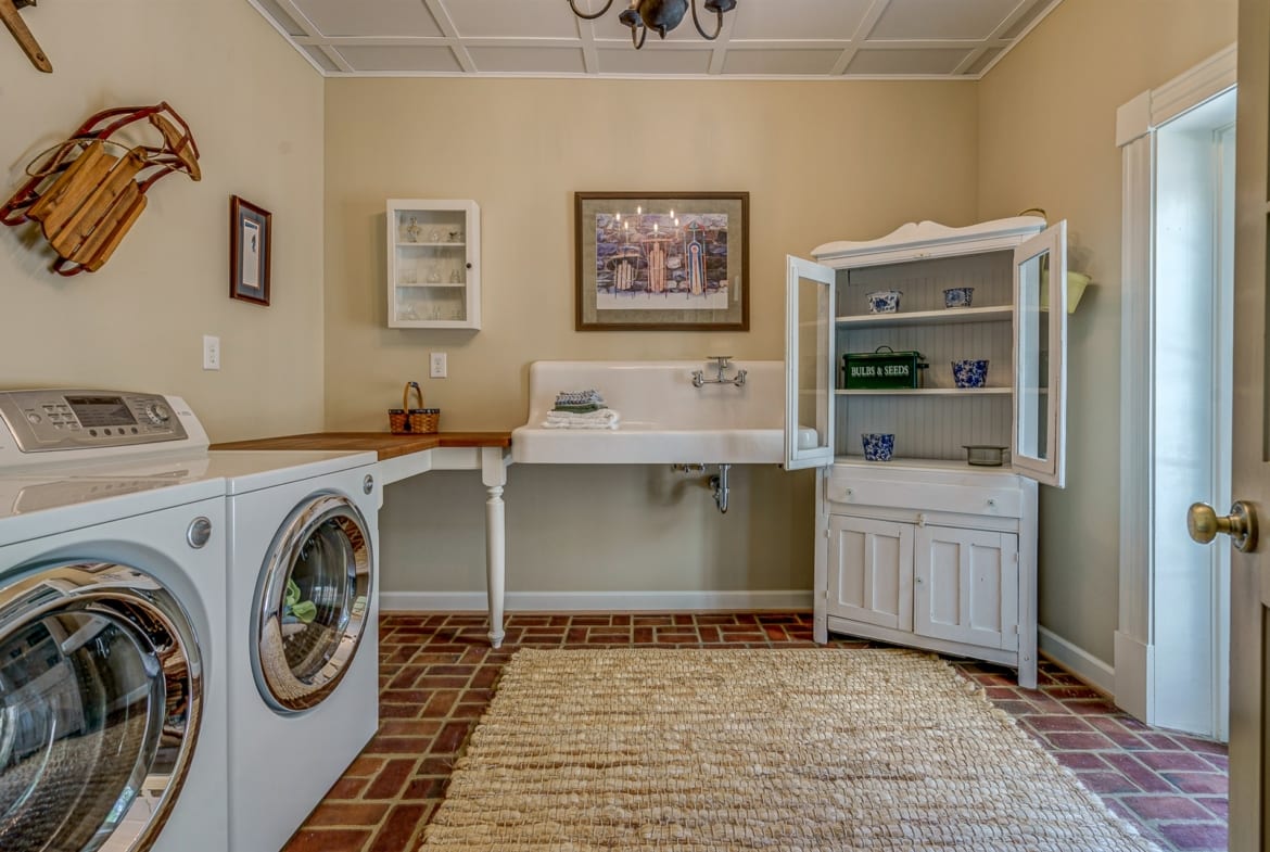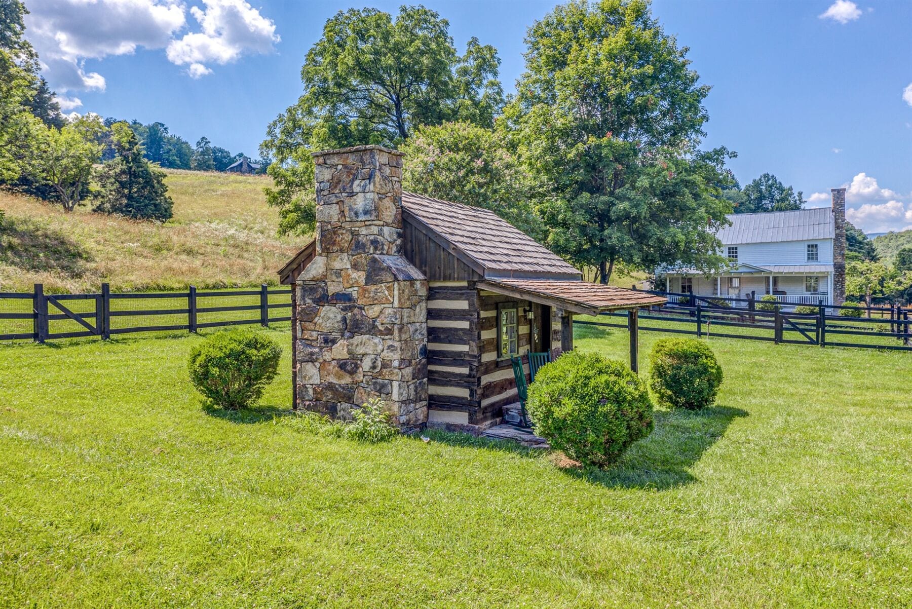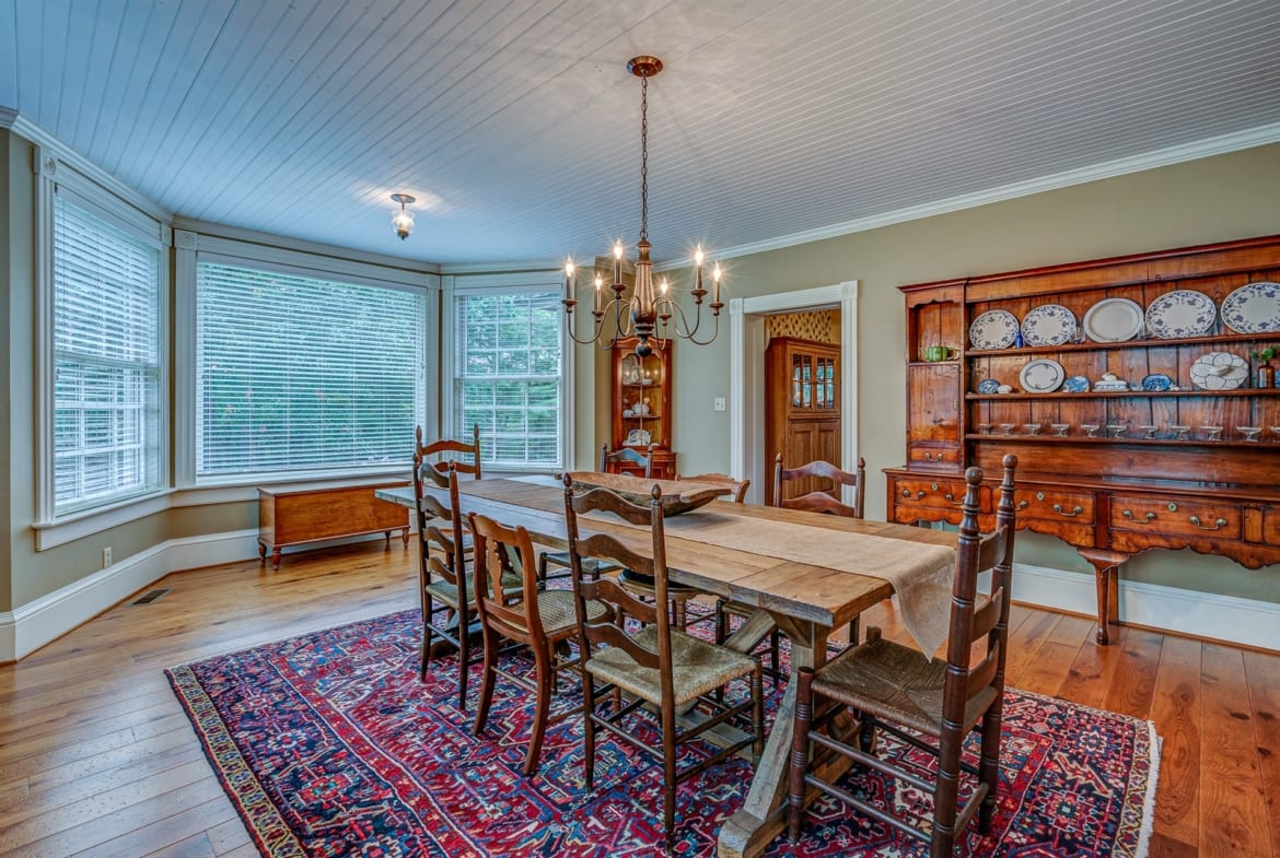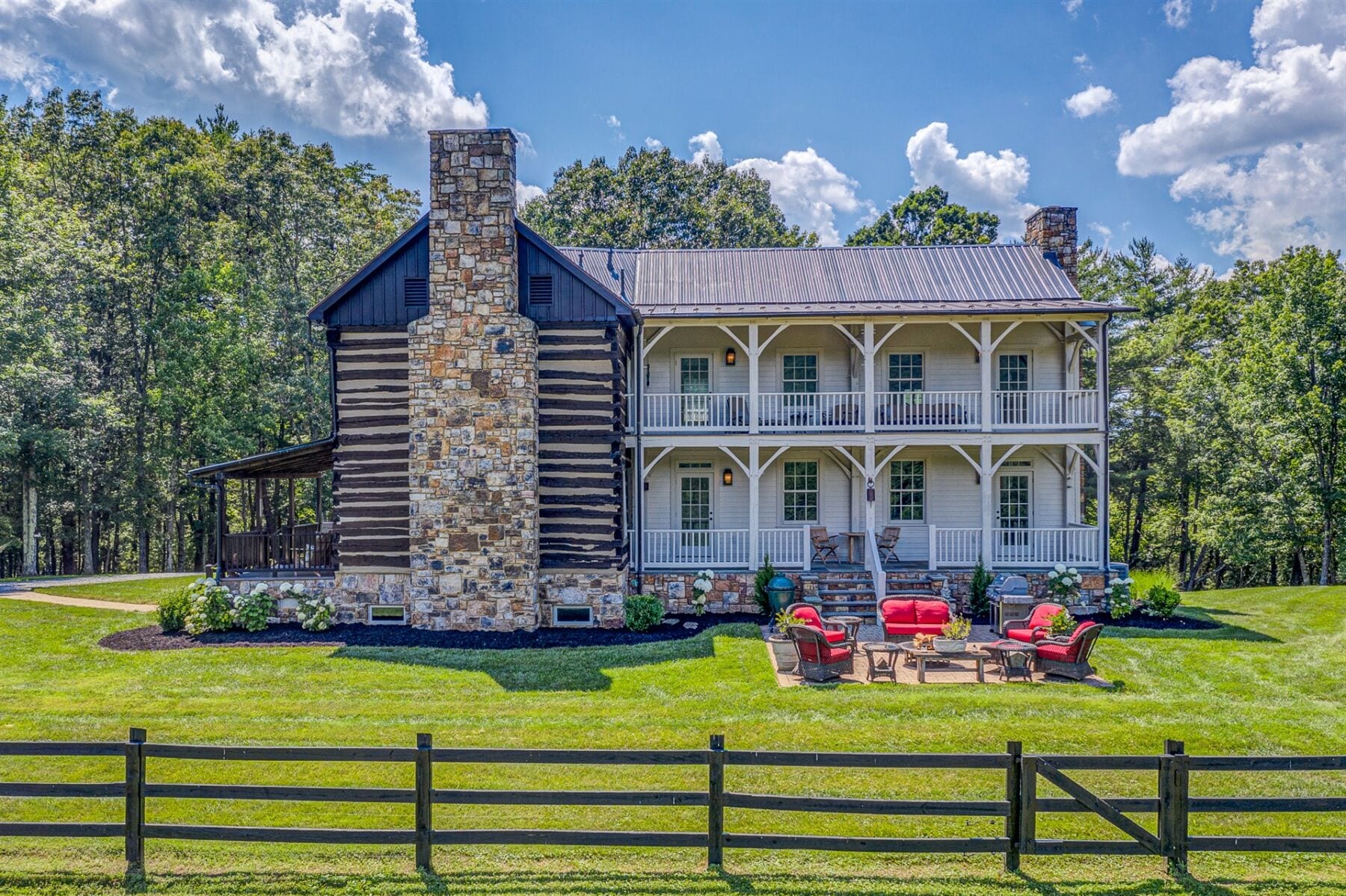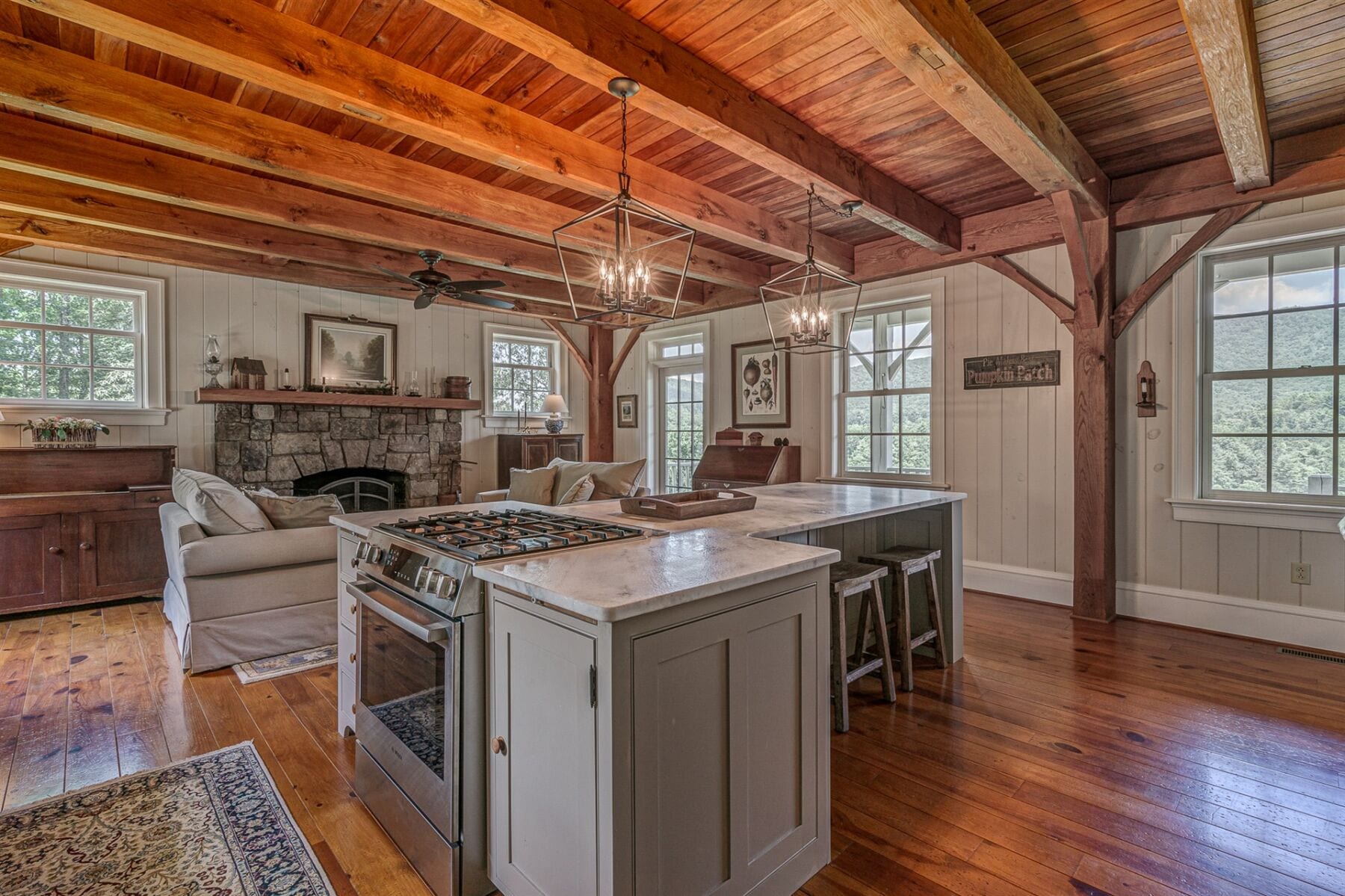 For the custom-built home, the original log cabin was relocated from WV and rebuilt while the stone portion of the home, including 5 large fireplaces, 2 chimneys and exterior walls, was constructed using stone sourced from the property. The interior millwork including solid-core doors and 11″ baseboard was custom milled and constructed on-site. Major restoration efforts to return the home and property to its original glory began in 2017 and were completed in 2020.
