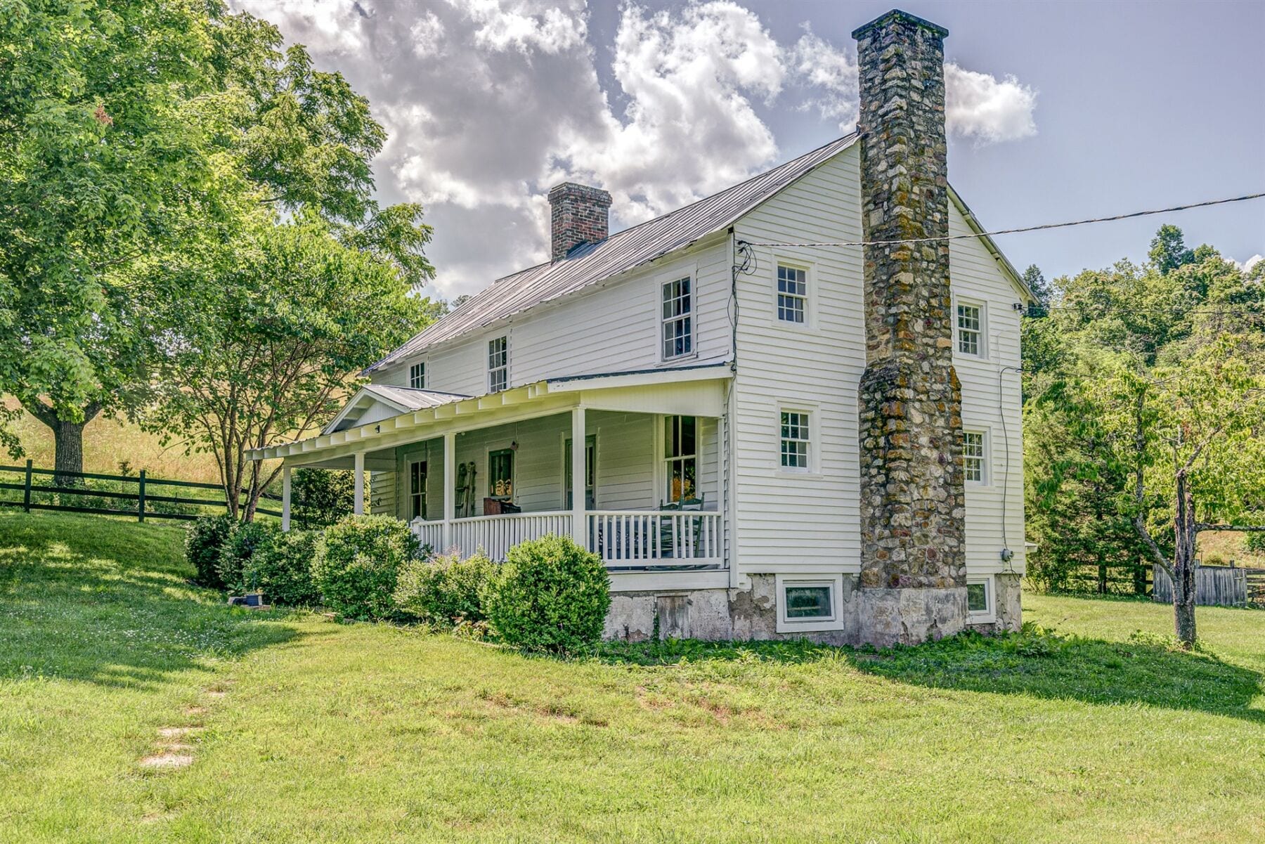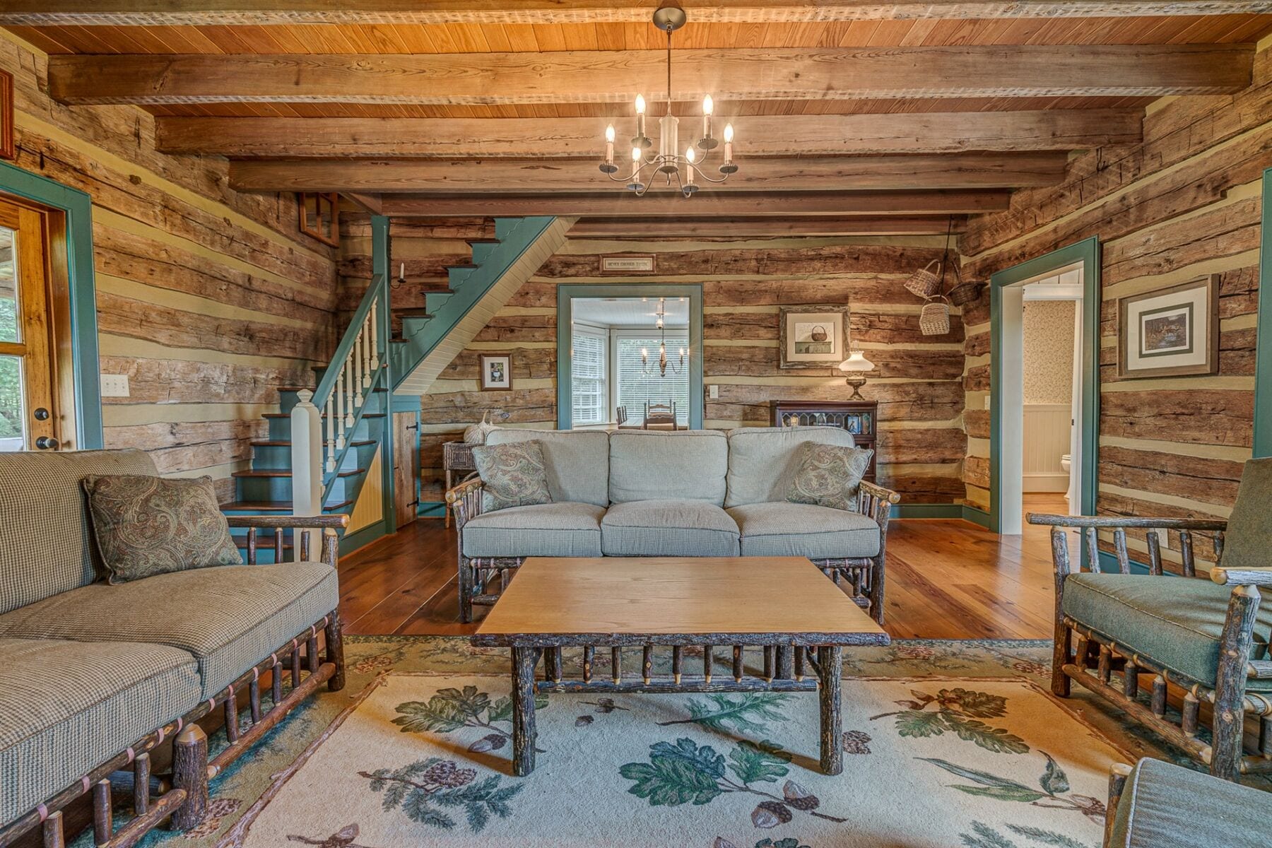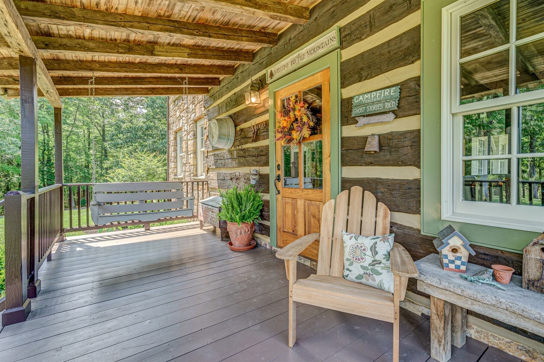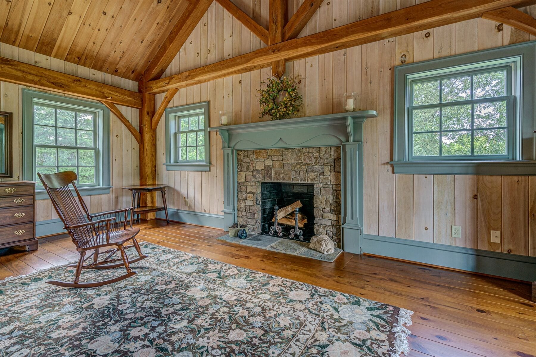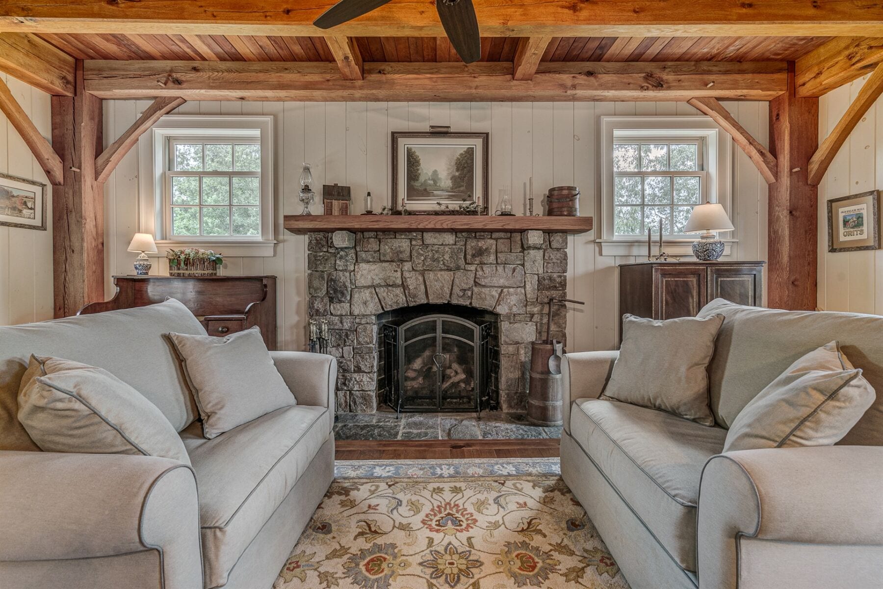 For the custom-built home, the original log cabin was relocated from WV and rebuilt while the stone portion of the home, including 5 large fireplaces, 2 chimneys and exterior walls, was constructed using stone sourced from the property. The interior millwork including solid-core doors and 11″ baseboard was custom milled and constructed on-site. Major restoration efforts to return the home and property to its original glory began in 2017 and were completed in 2020.