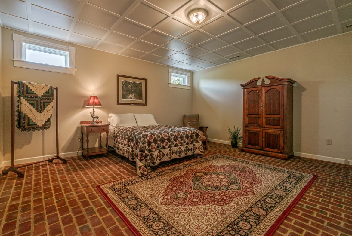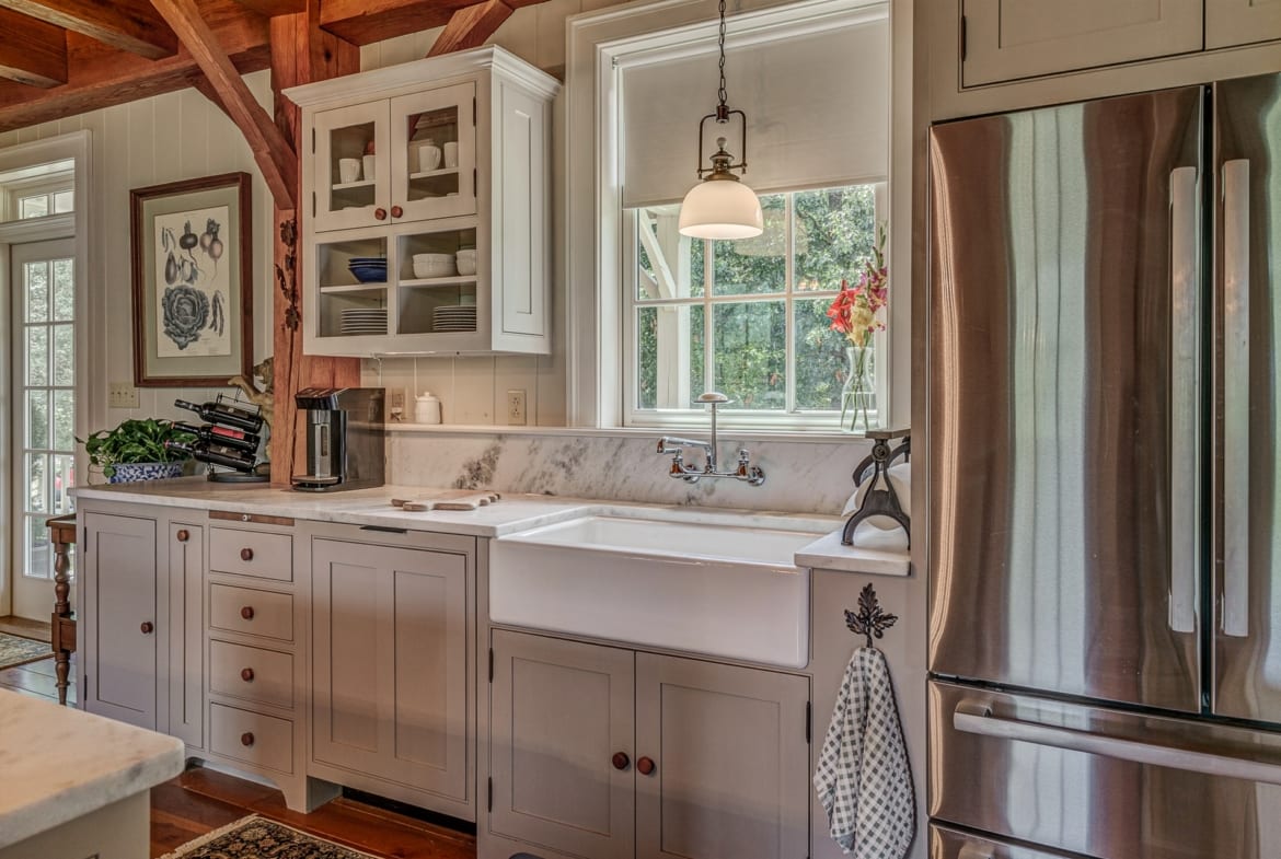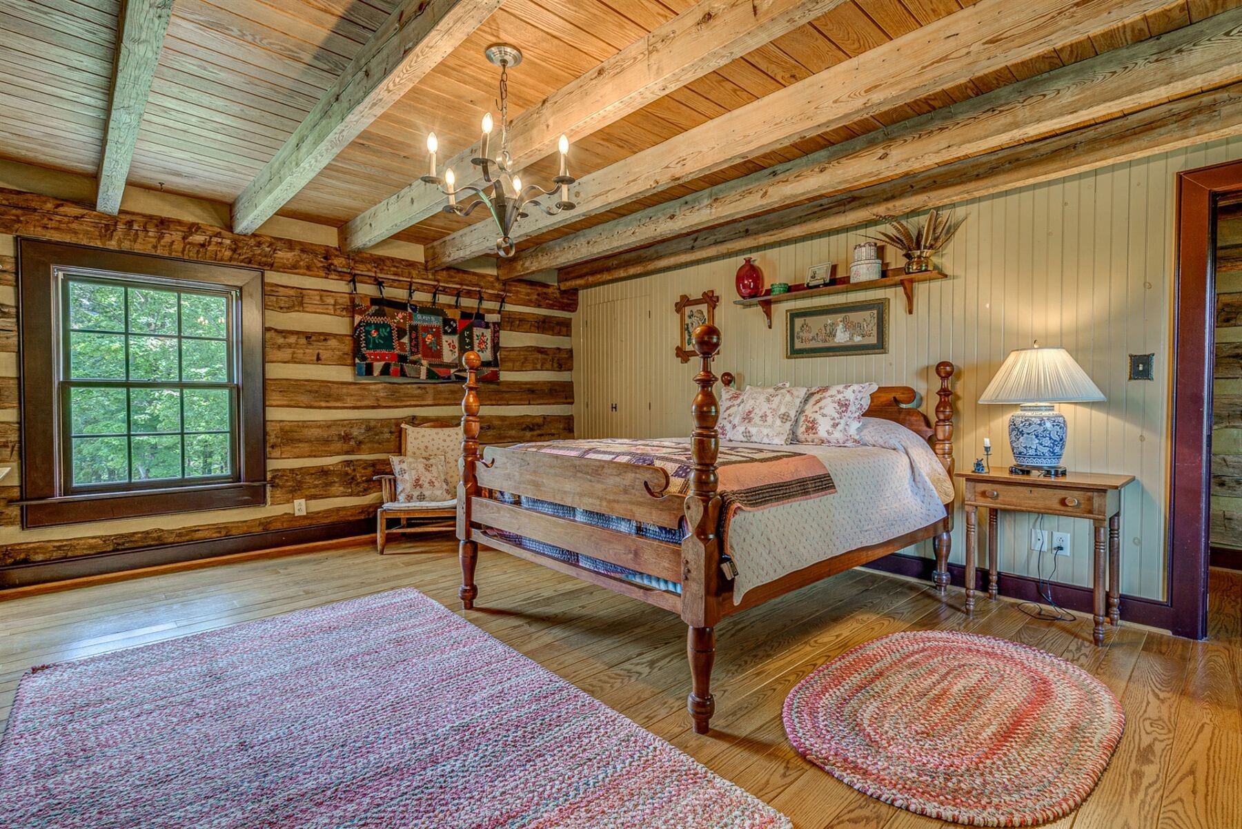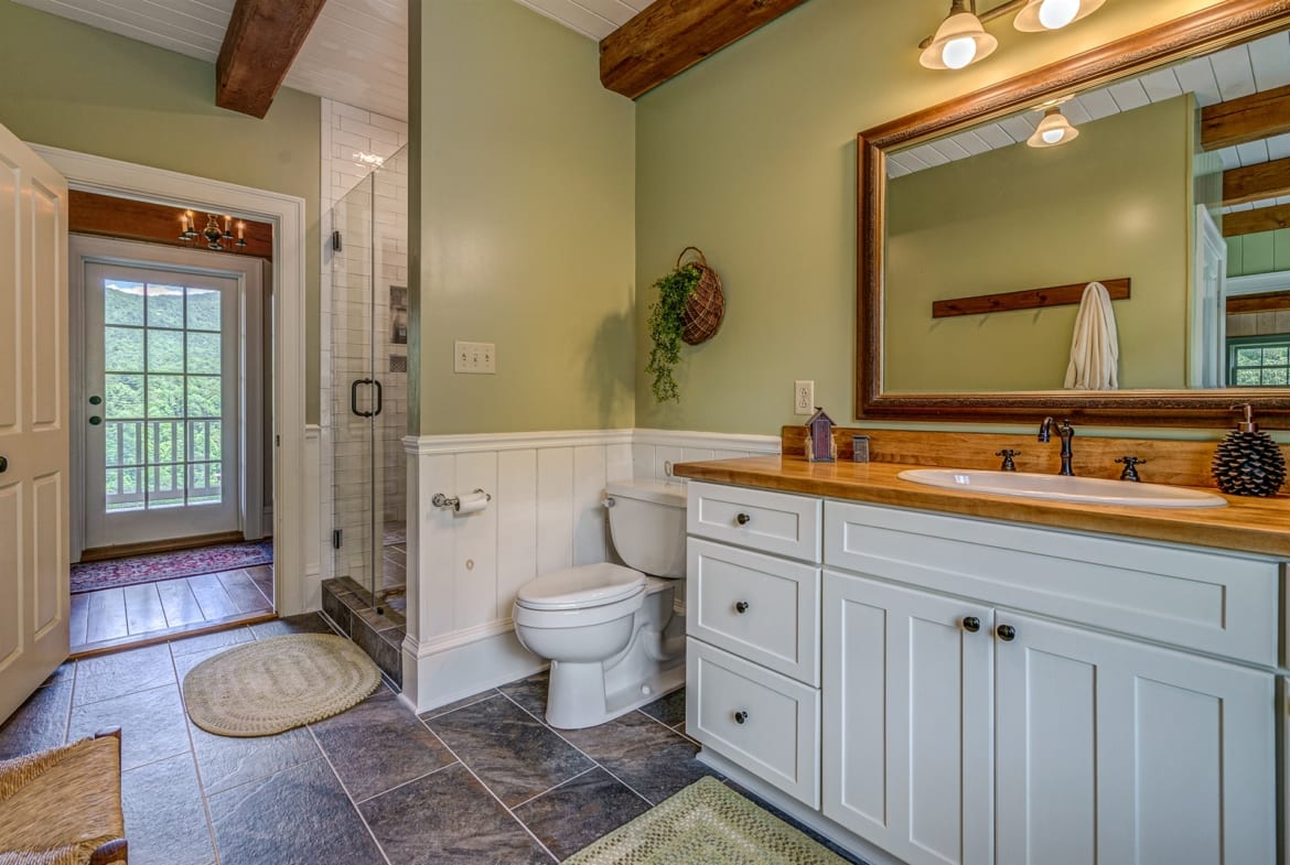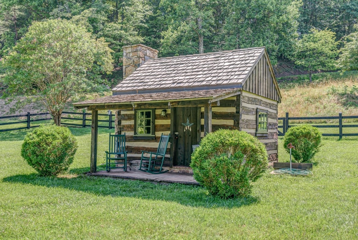 For the custom-built home, the original log cabin was relocated from WV and rebuilt while the stone portion of the home, including 5 large fireplaces, 2 chimneys and exterior walls, was constructed using stone sourced from the property. The interior millwork including solid-core doors and 11″ baseboard was custom milled and constructed on-site. Major restoration efforts to return the home and property to its original glory began in 2017 and were completed in 2020.
