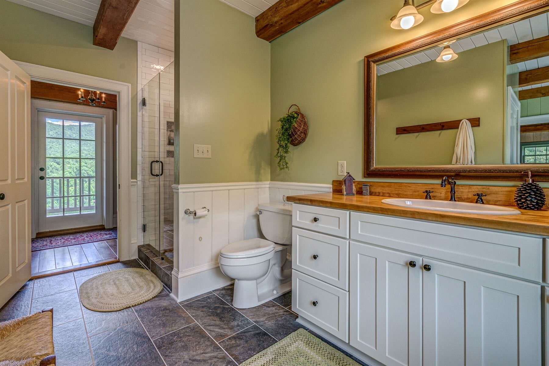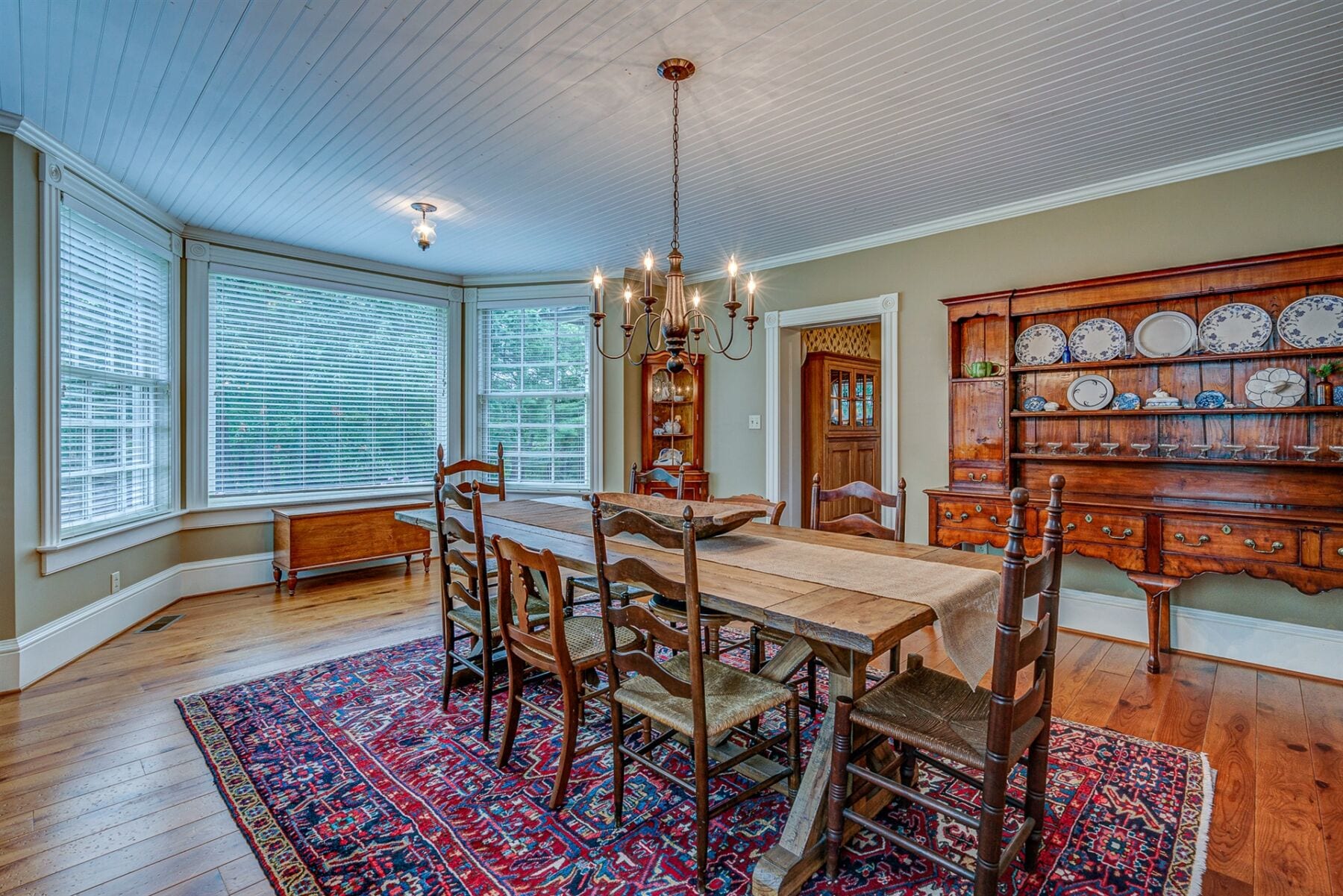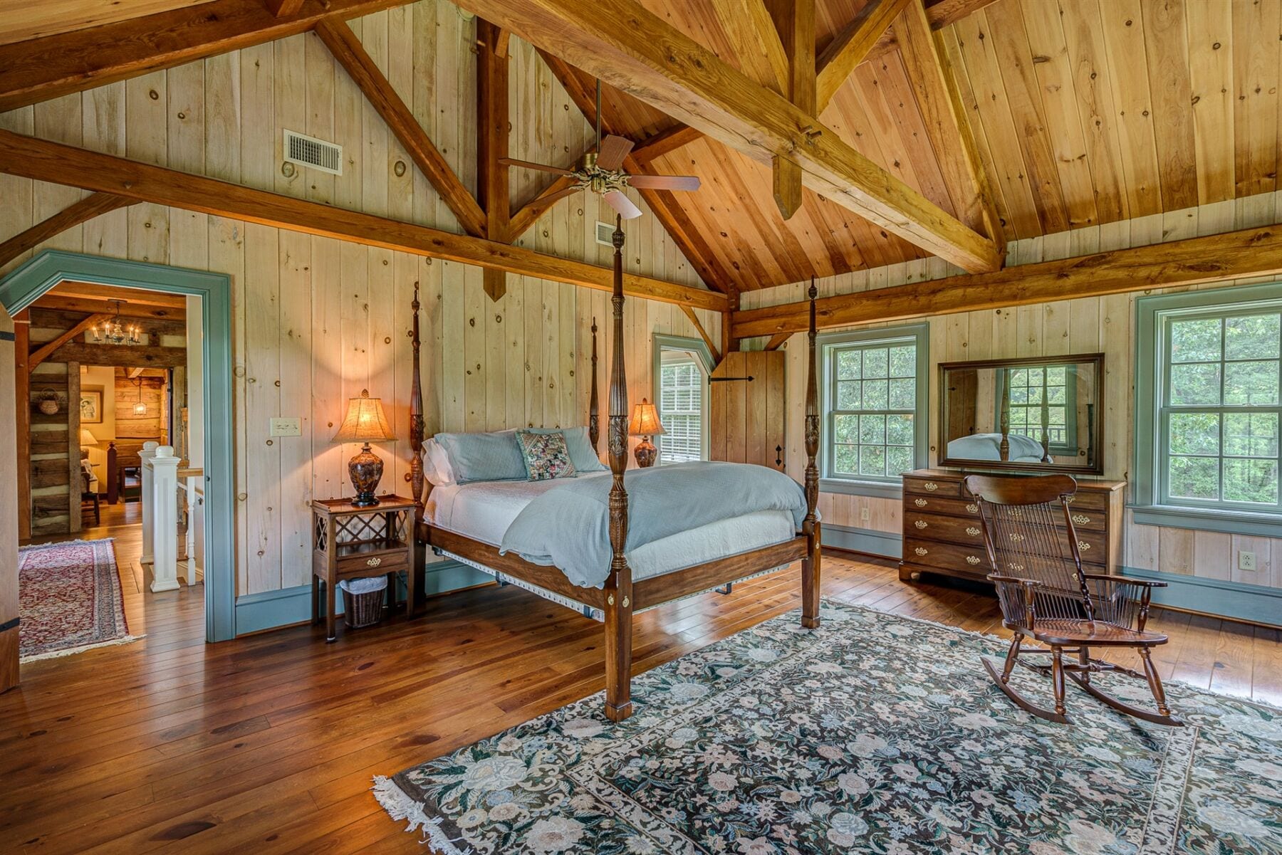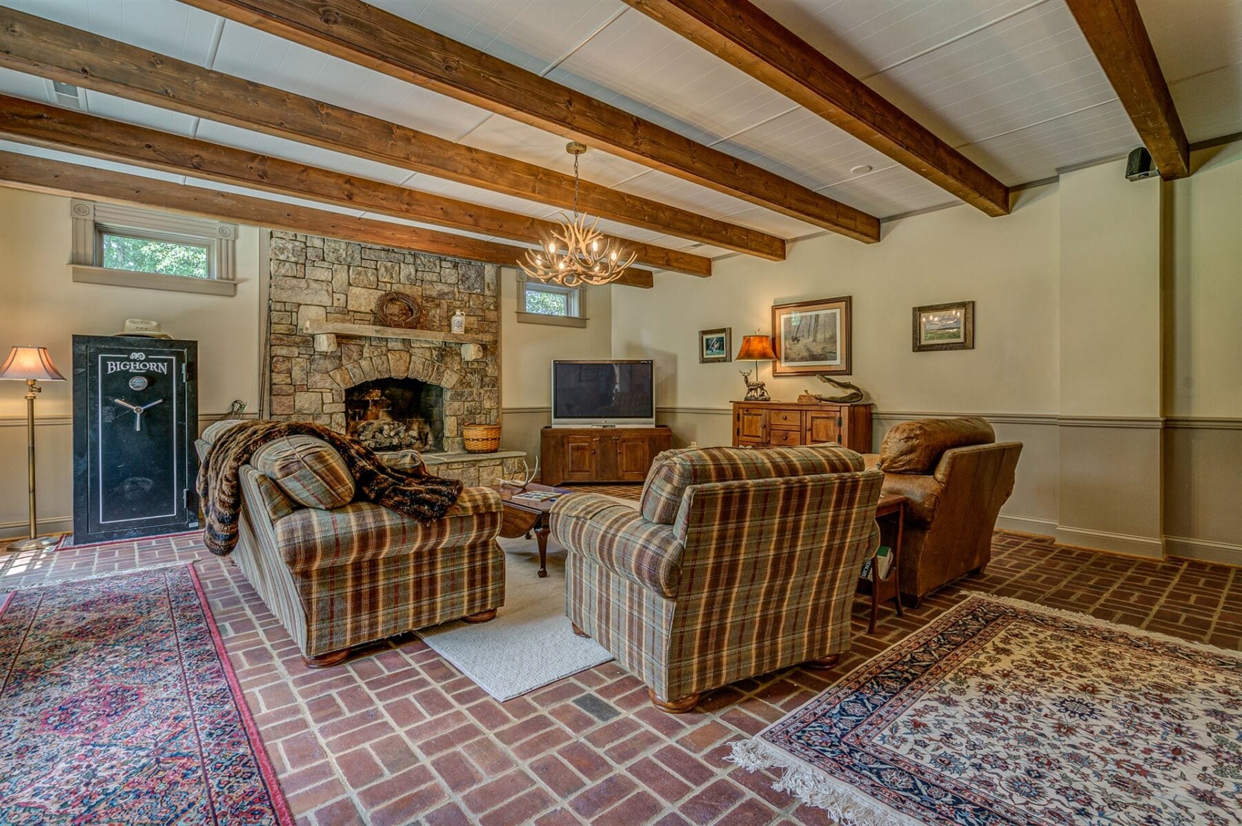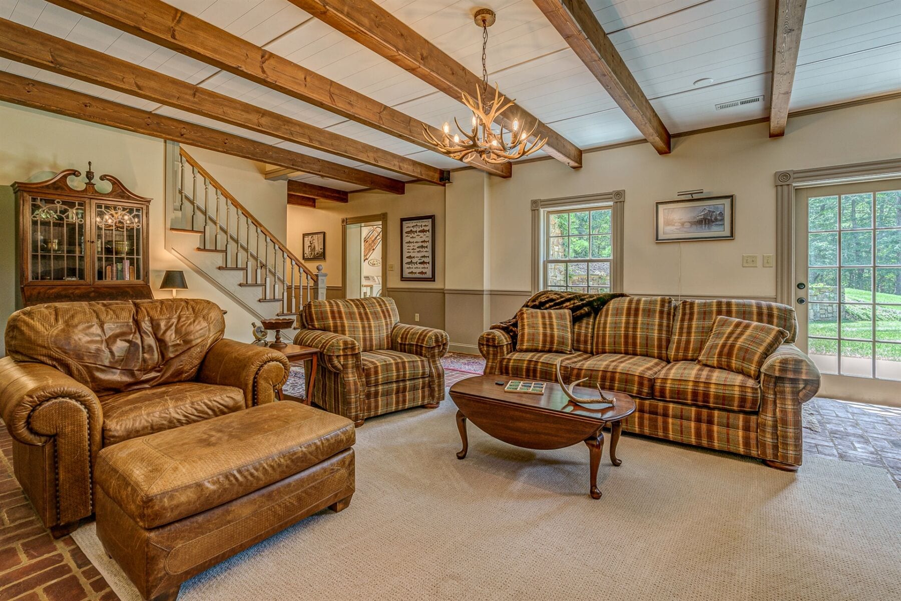For the custom-built home, the original log cabin was relocated from WV and rebuilt while the stone portion of the home, including 5 large fireplaces, 2 chimneys and exterior walls, was constructed using stone sourced from the property. The interior millwork including solid-core doors and 11″ baseboard was custom milled and constructed on-site. Major restoration efforts to return the home and property to its original glory began in 2017 and were completed in 2020.