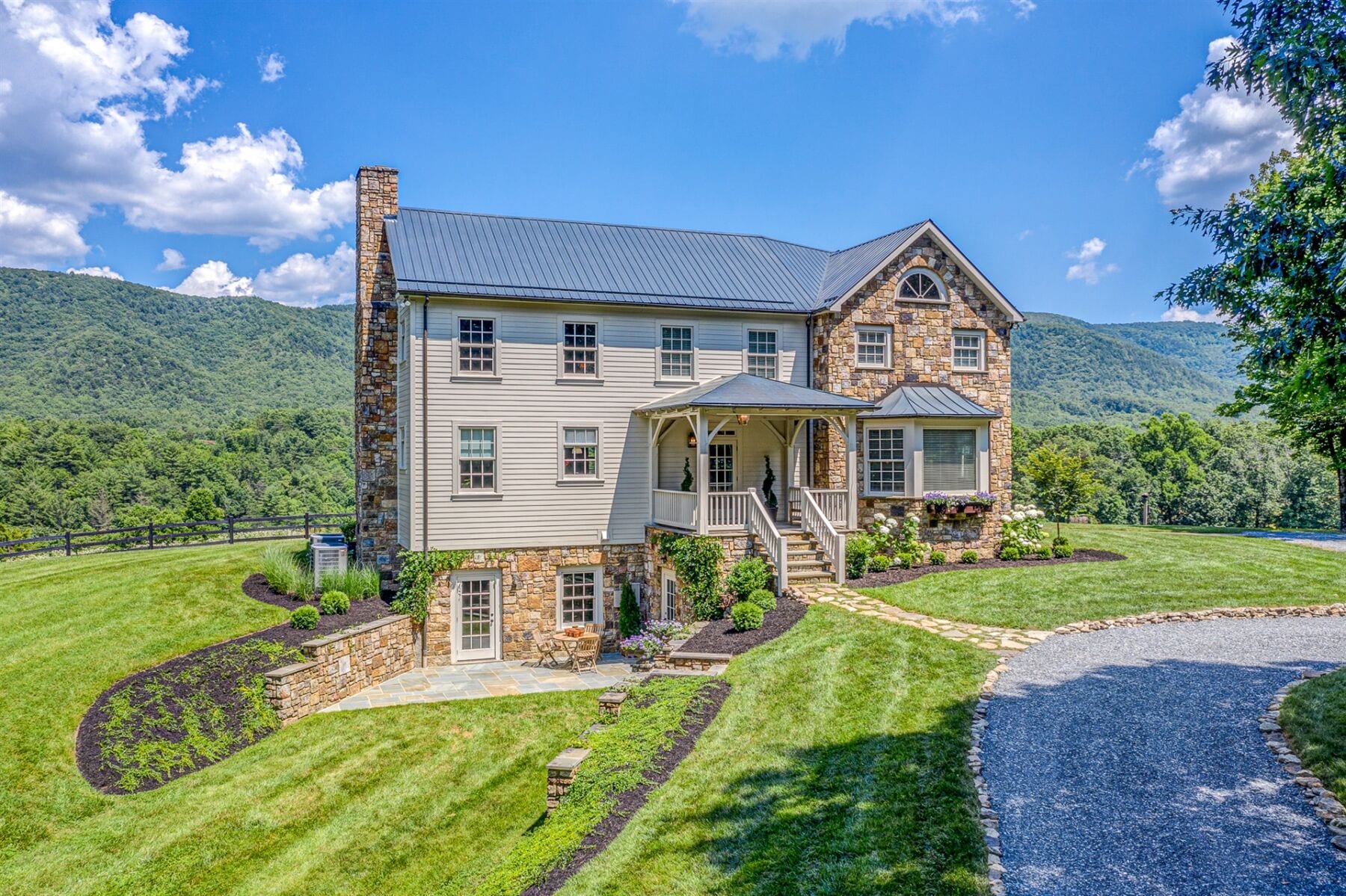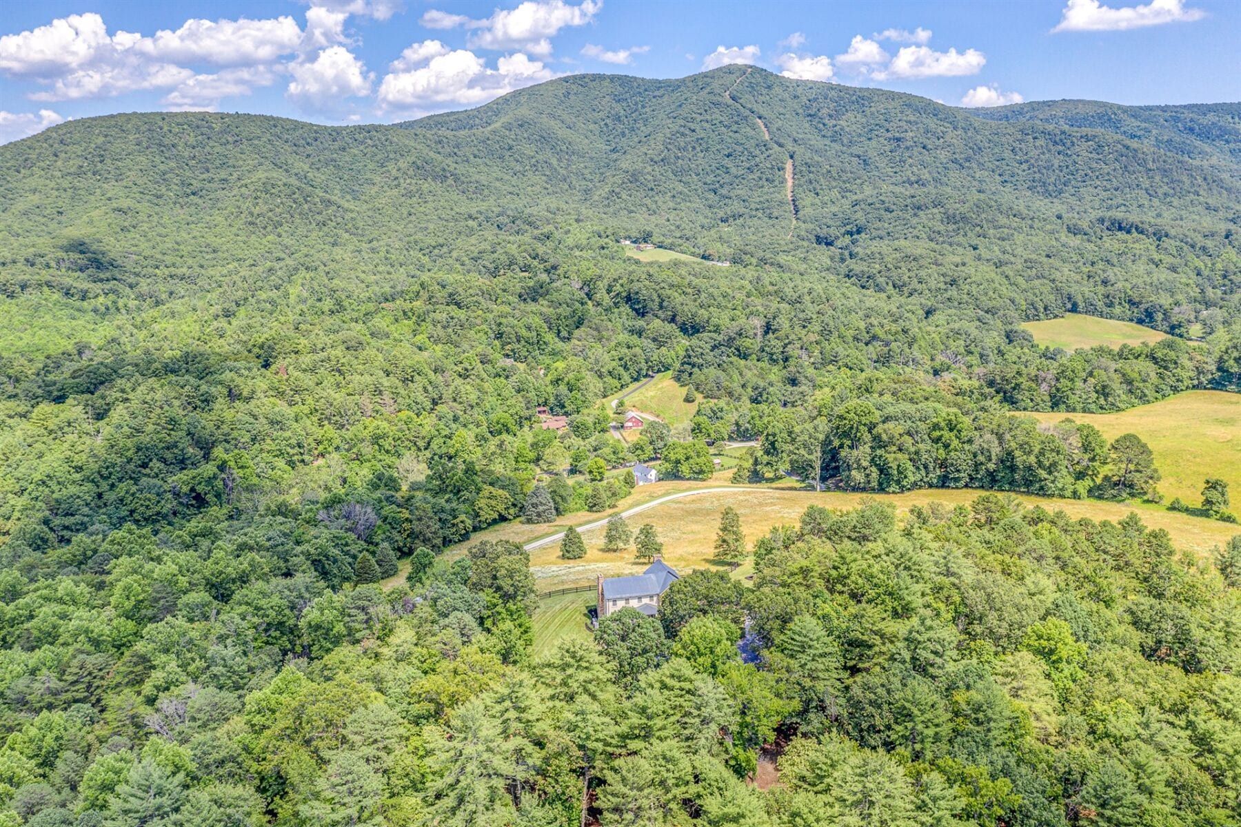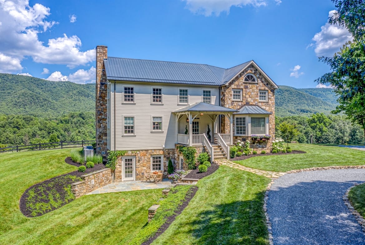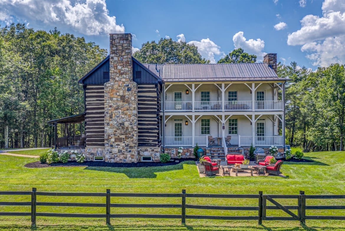 Majestically sited on a pastoral hilltop with breathtaking panoramic Blue Ridge Mountain views, the main home was built with a vision of marrying a historic 1807 hand-hewn log cabin with a custom built, stone & timber frame portion to create a masterfully designed one-of-a-kind estate on 44ac+/-. 5,000SF+/- with gourmet eat-in kitchen open to intimate den with stone FP, elegant DR with large bay window, formal LR with original logs & ceiling with exposed beams, 5 generously sized BRs, 3.5 fully renovated BAs, along with inviting FR on terrace level, 4 large porches, & 2 hardscaped patios providing space to unwind at days end. Estate also features 1829 guest house, tiny cabin, beautiful creek, stately trees, and productive pasture to round out this phenomenal mountain estate.